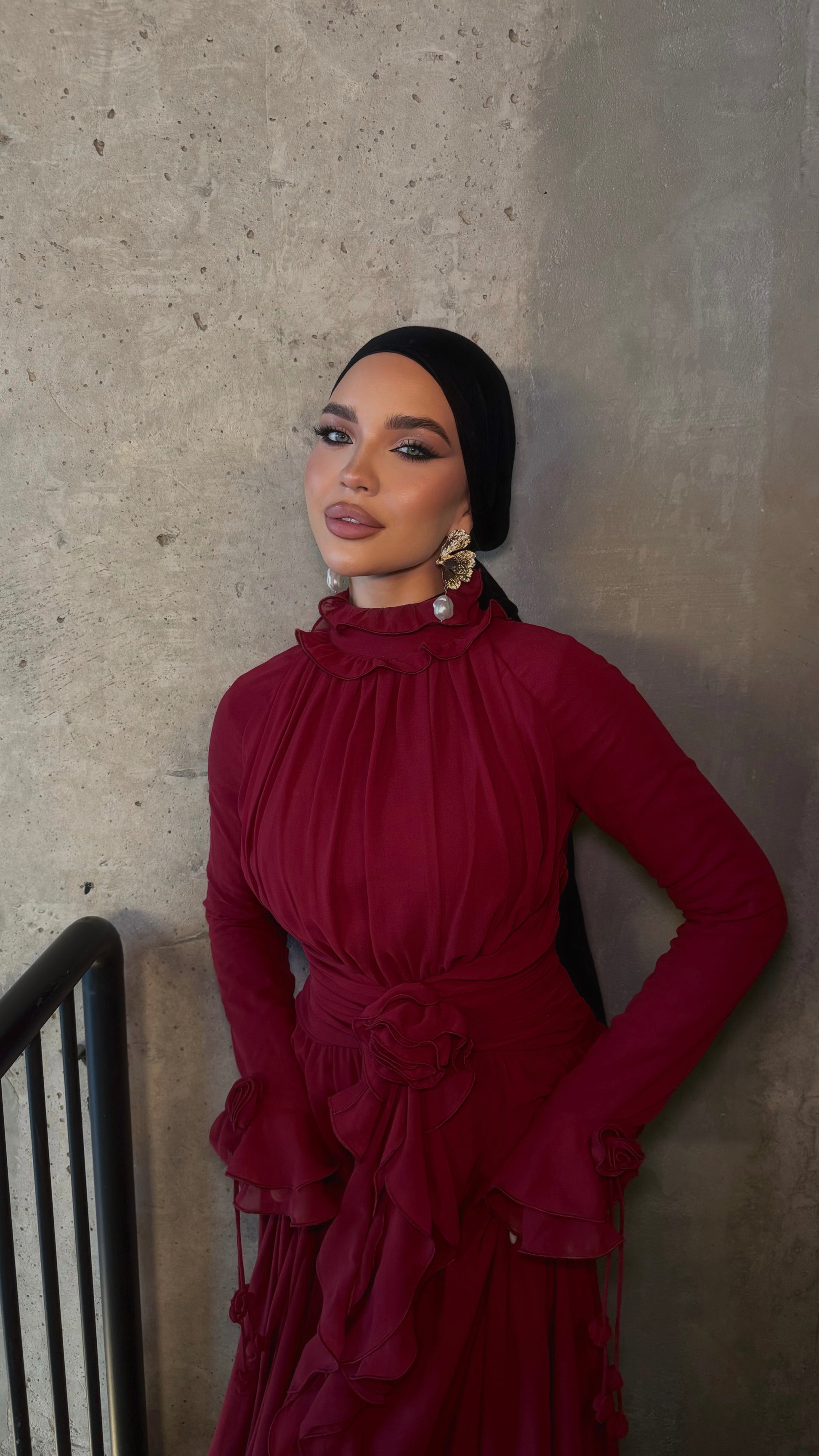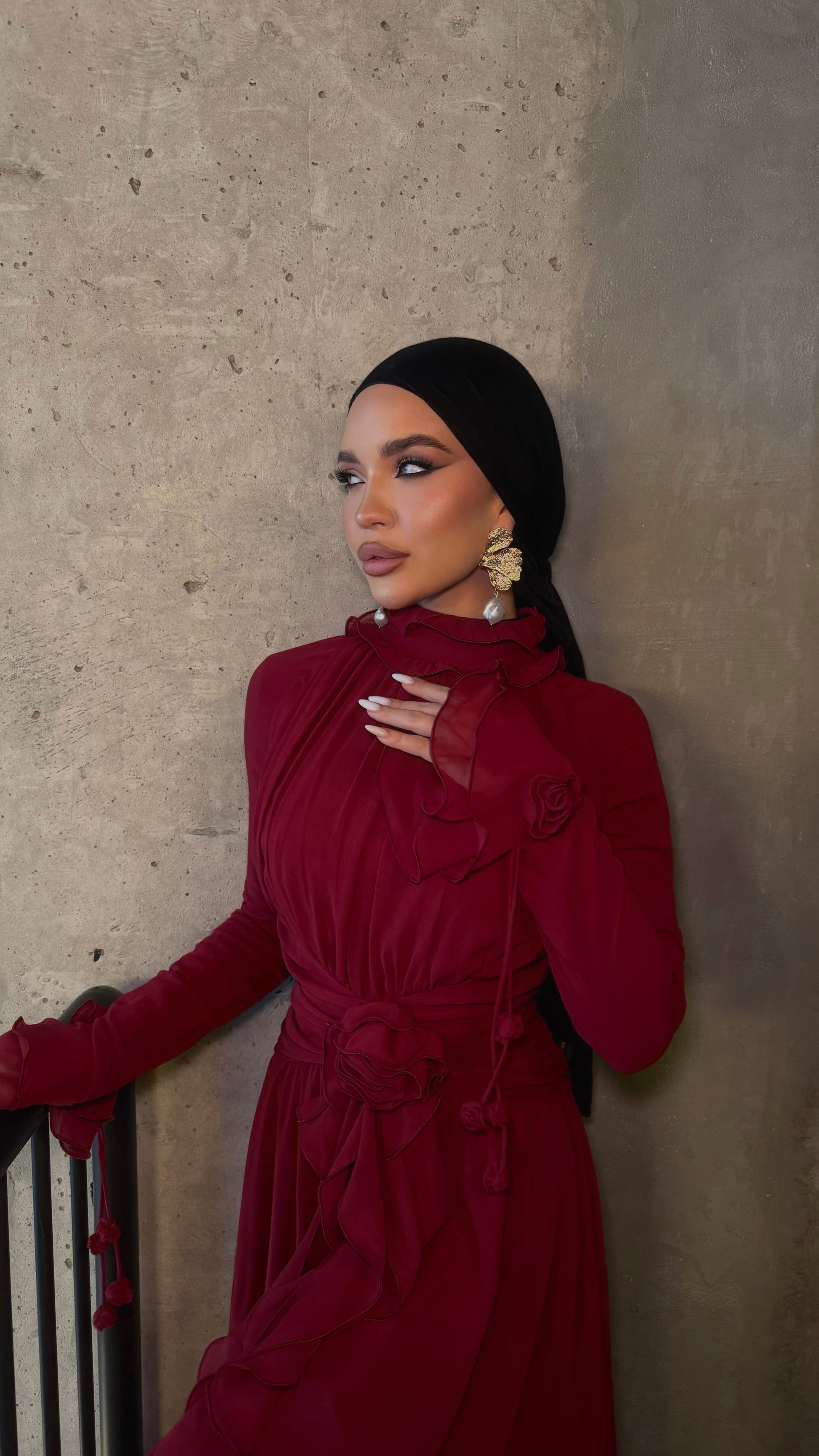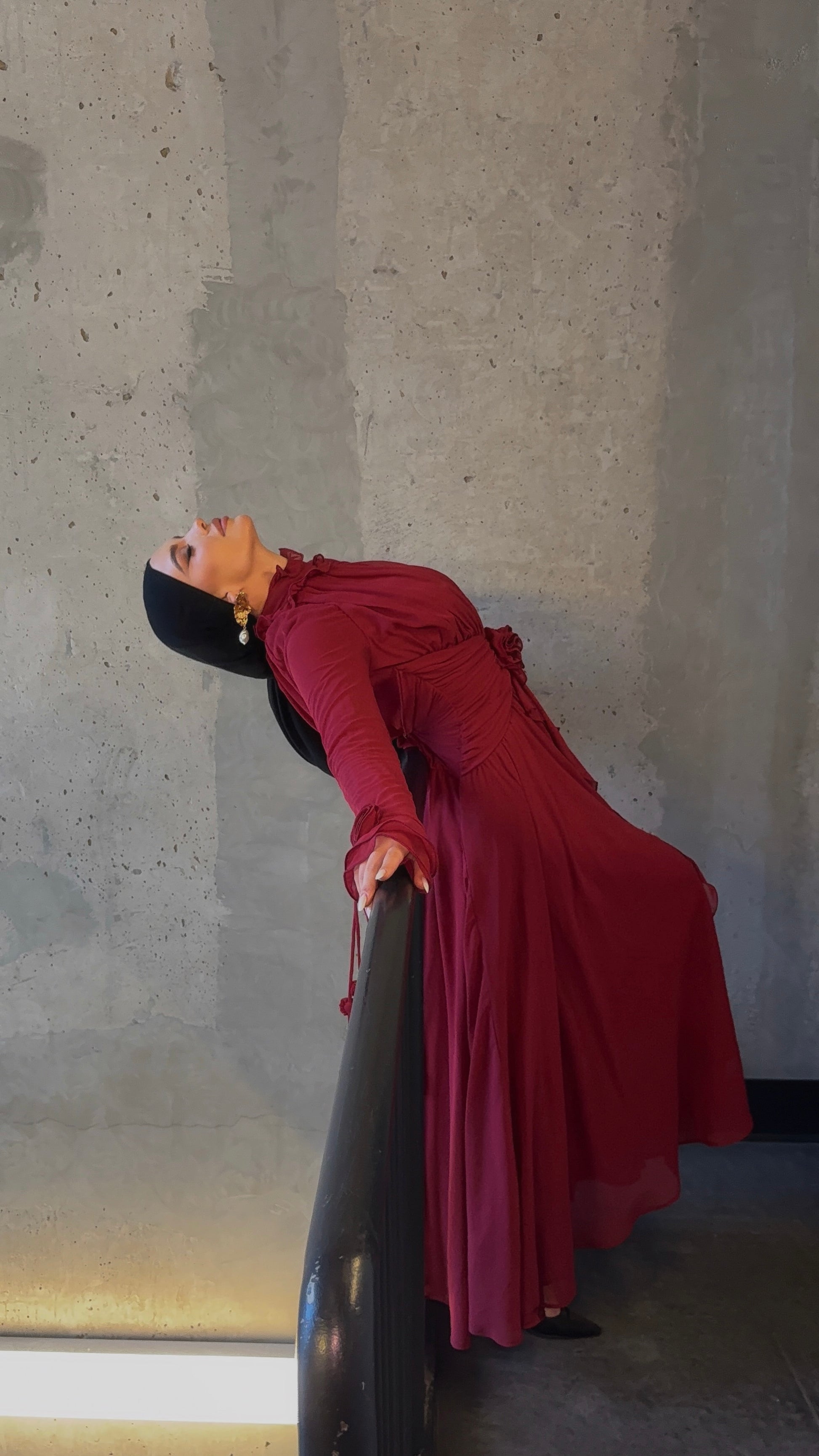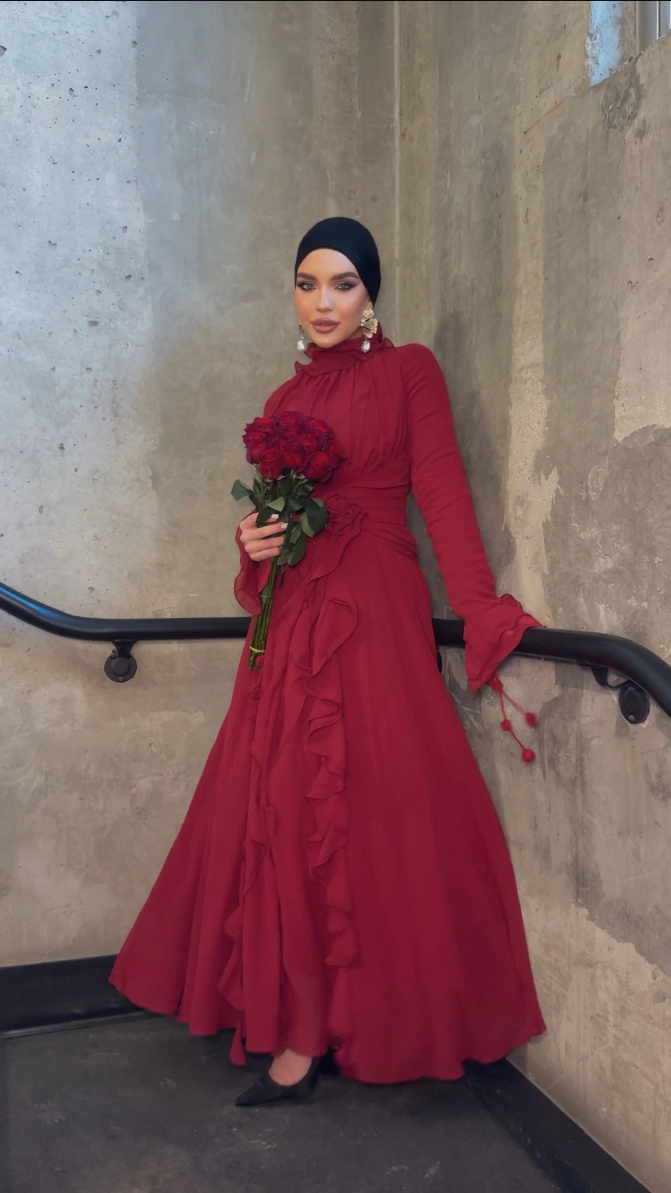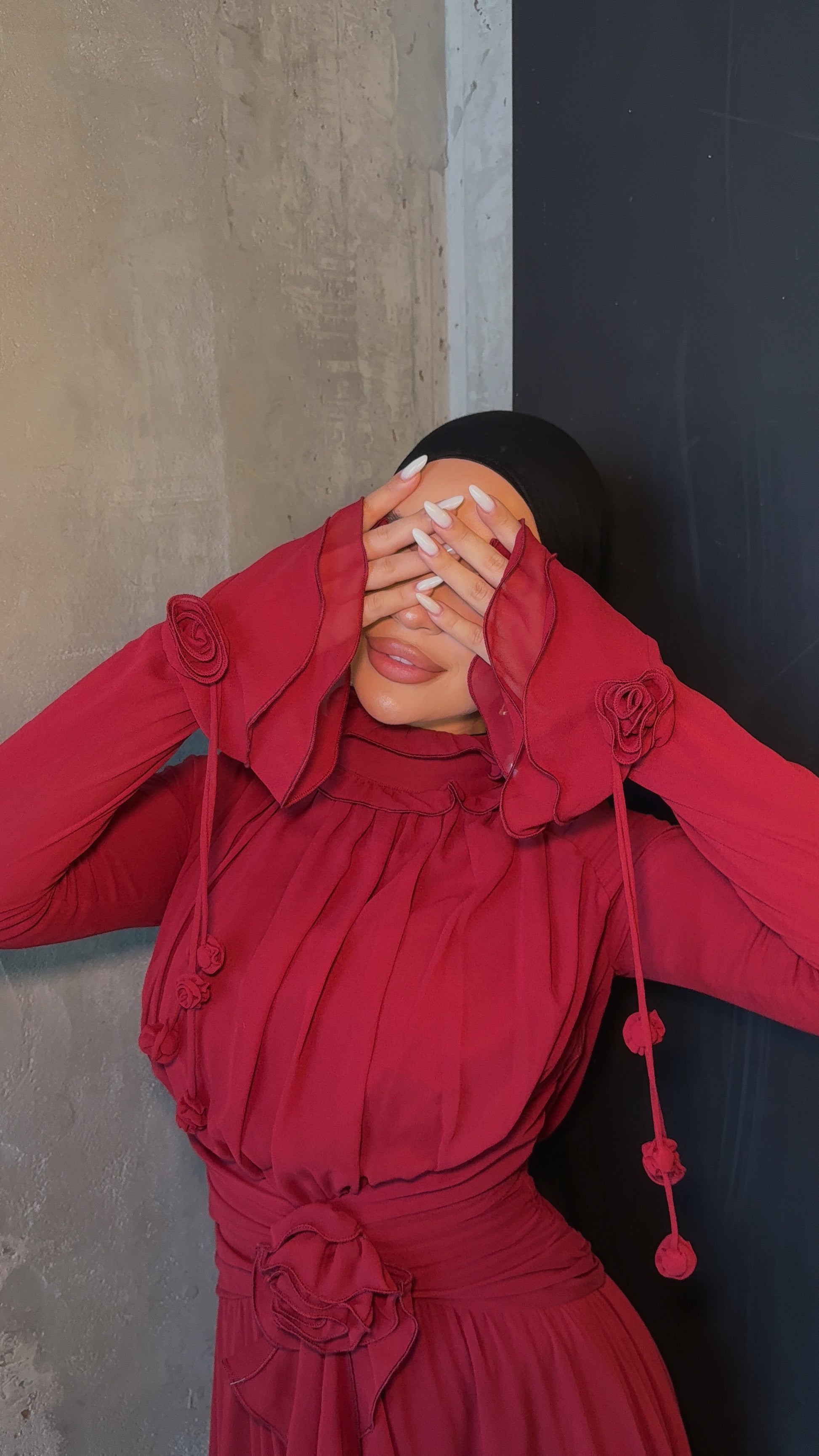 - Double-layered fluted bell sleeves with rose-tie detailing at the cuff