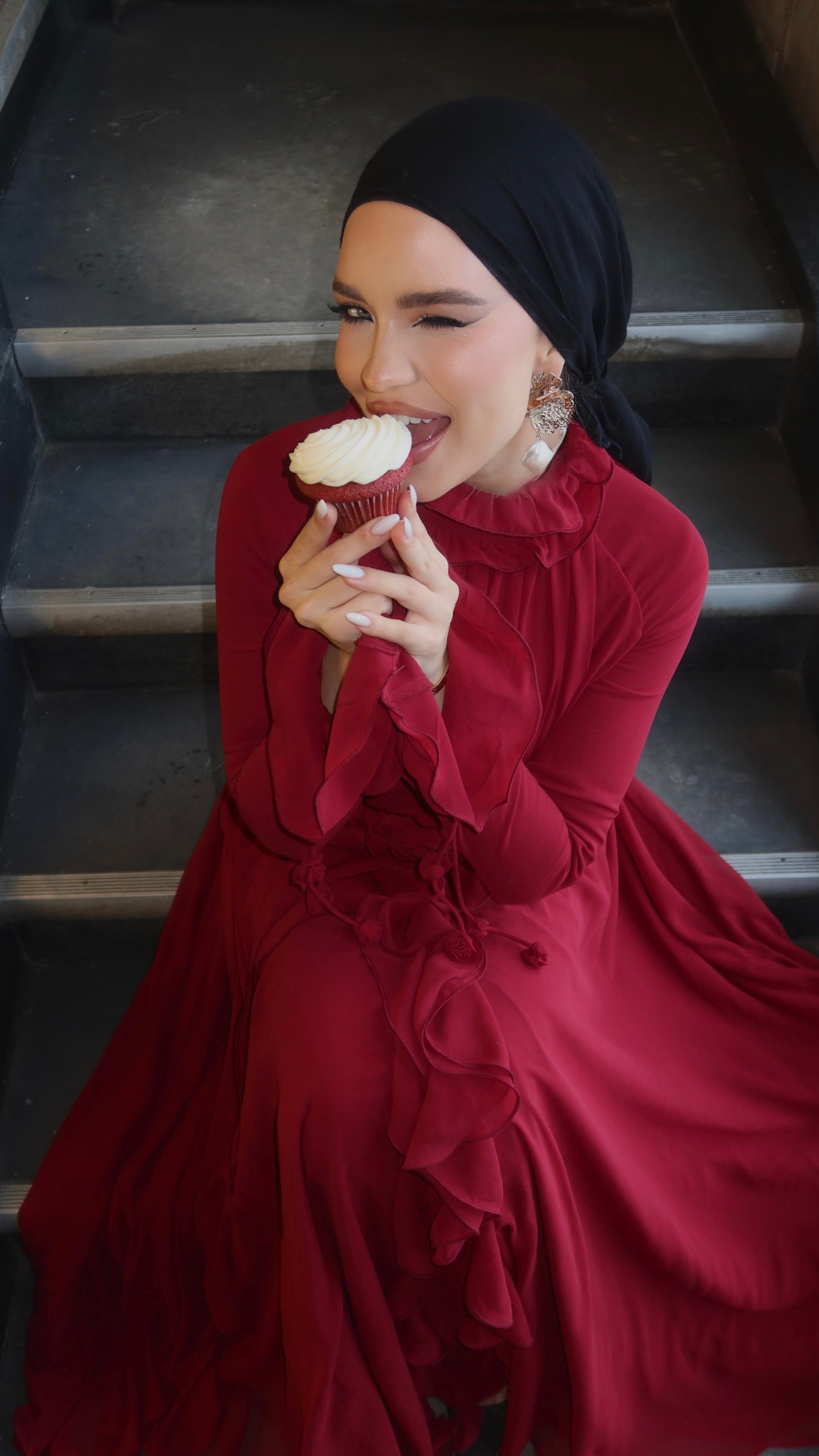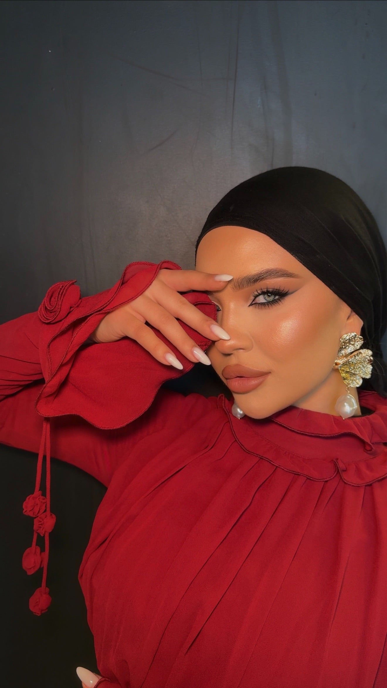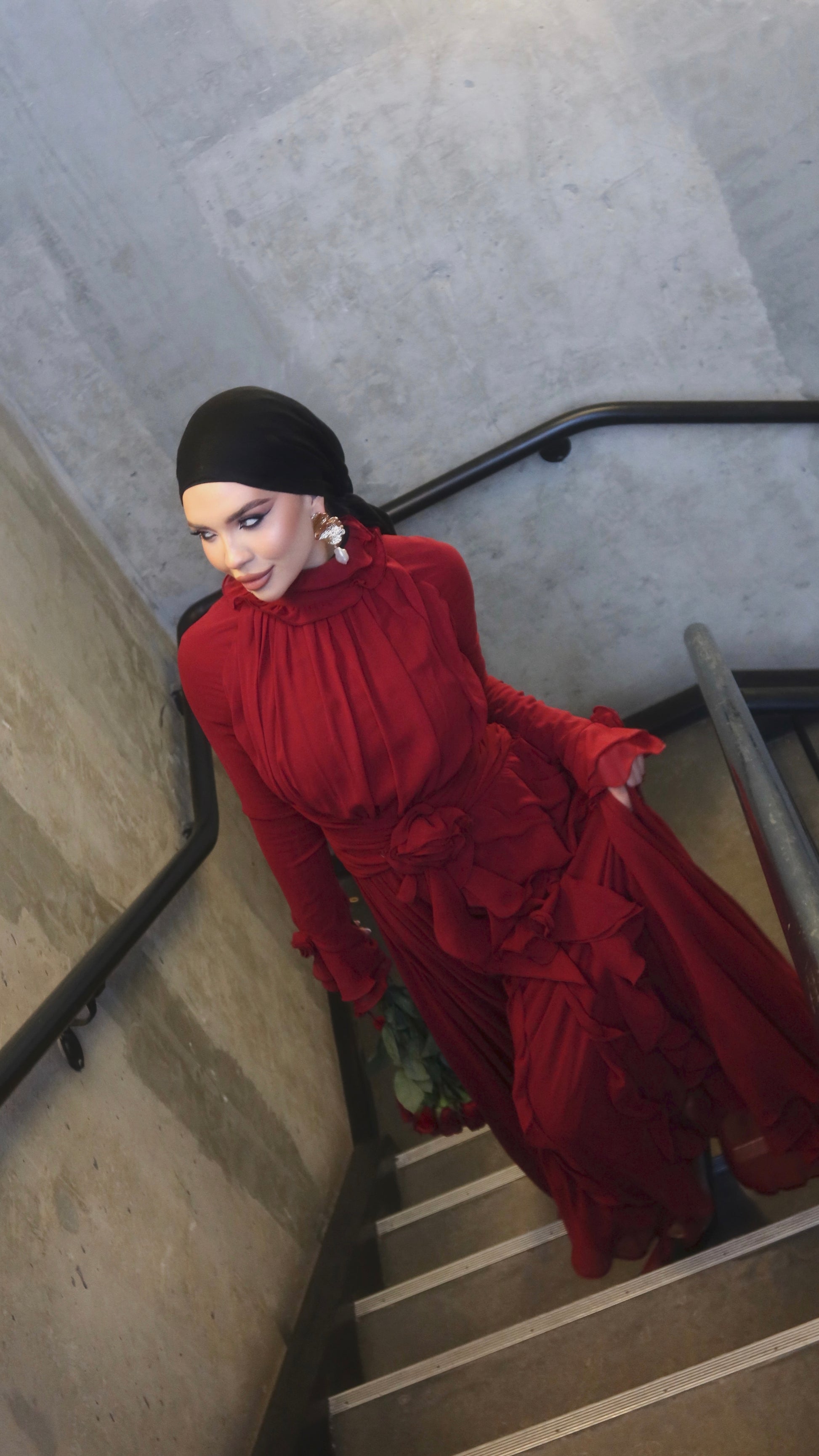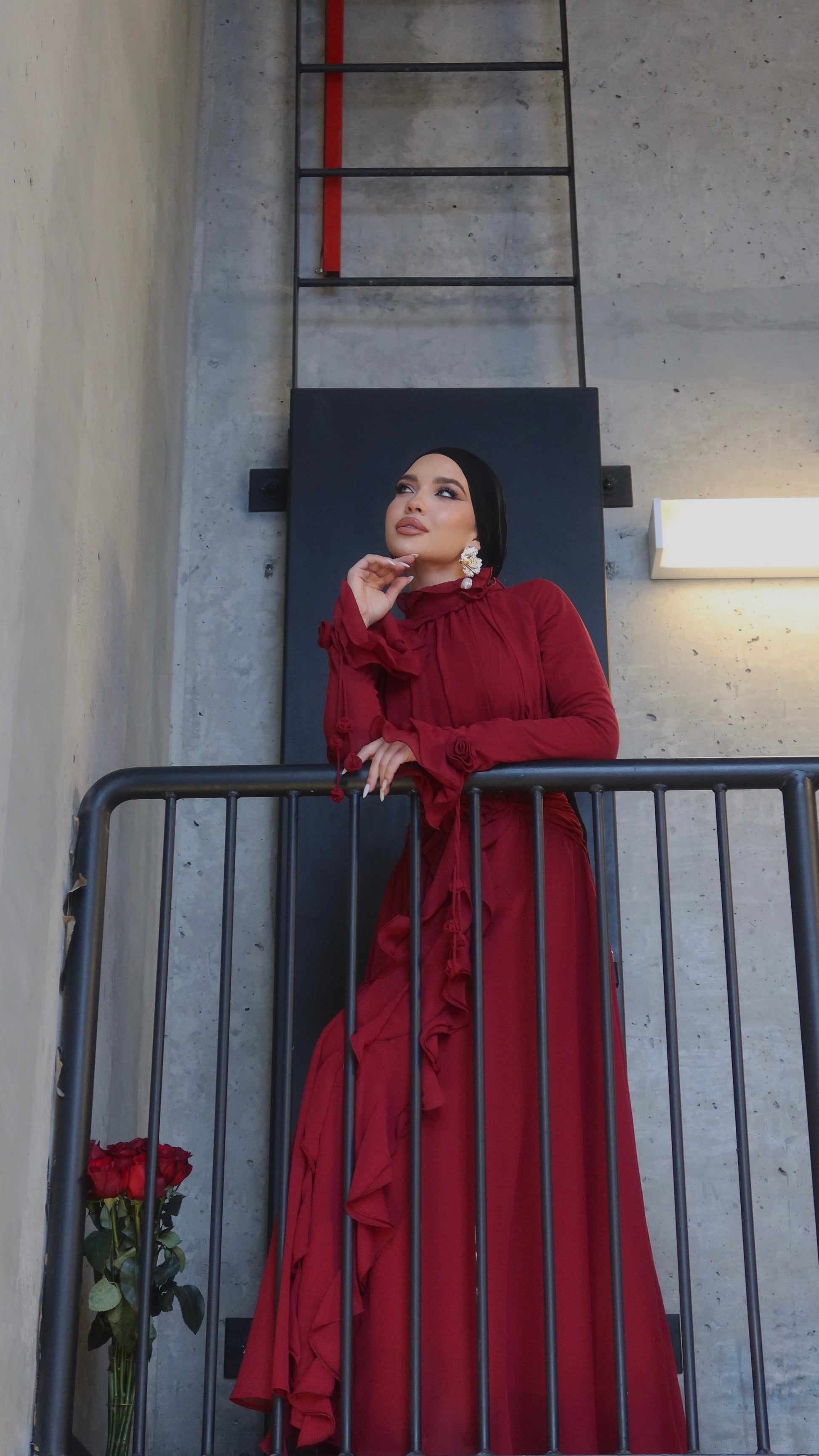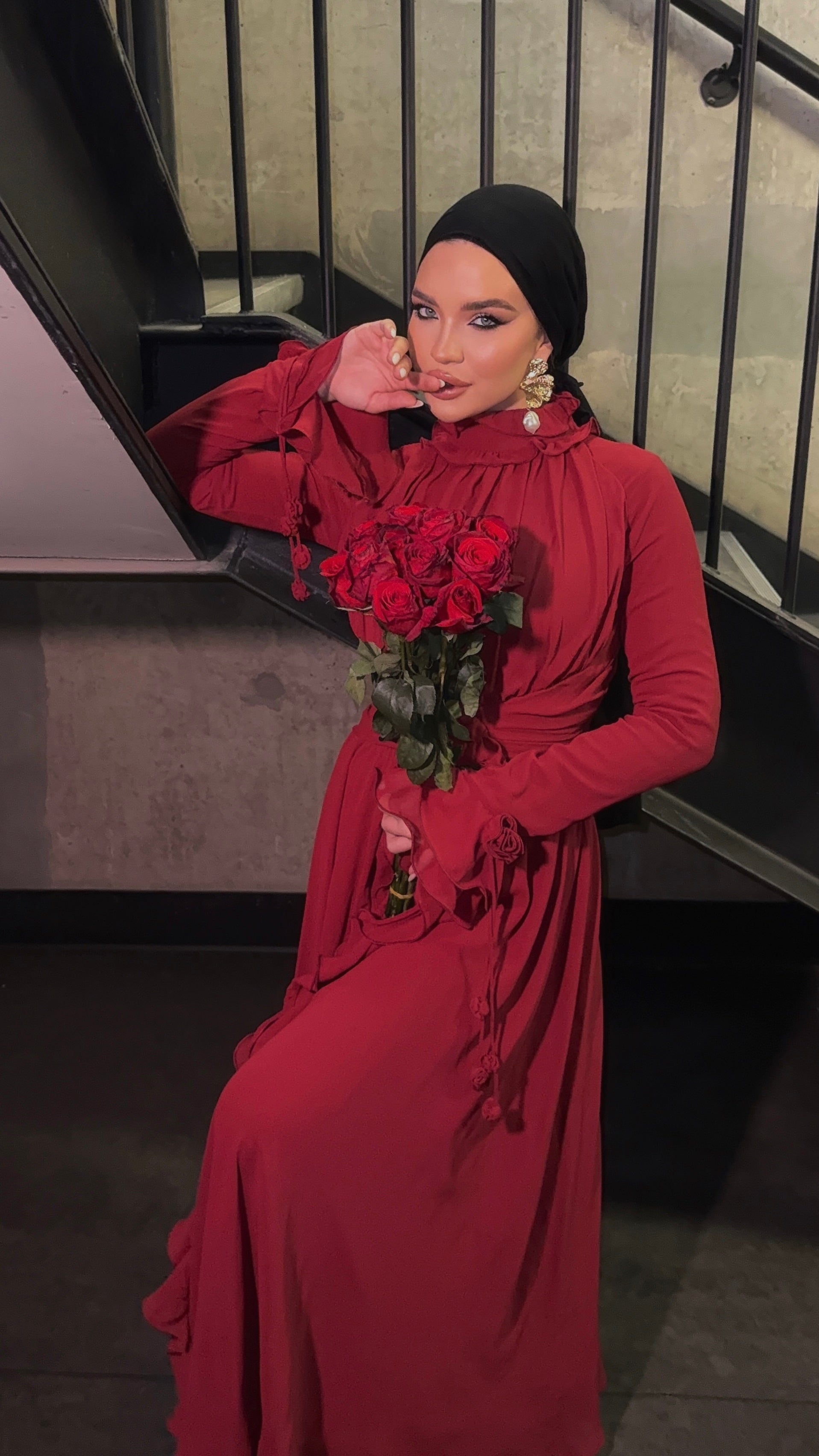 - Double-layered fluted bell sleeves with rose-tie detailing at the cuff